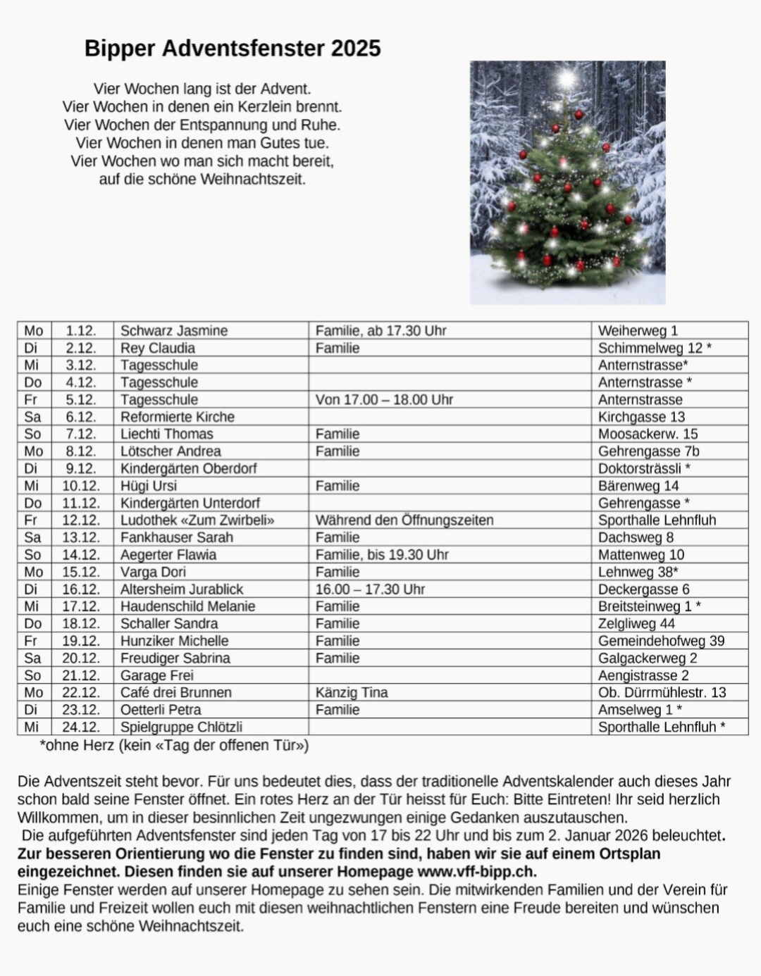 Die Adventszeit steht bevor. Für uns bedeutet dies, dass der traditionelle Adventskalender auch dieses Jahr schon bald seine Fenster öffnet. Ein rotes Herz an der Tür heisst für euch: „Bitte eintreten“. Ihr seid herzlich willkommen bei einer Tasse Tee oder Kaffee, um in dieser besinnlichen Zeit ungezwungen einige Gedanken auszutauschen. Die aufgeführten Adventsfenster sind jeden Tag von 17 bis 22 Uhr und bis zum 2. Januar 2026 beleuchtet.
