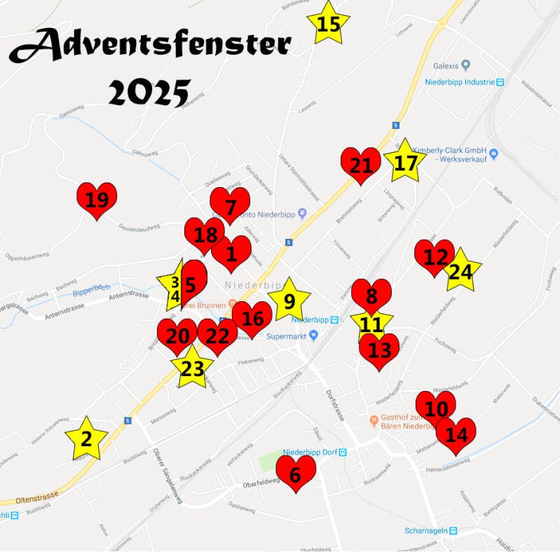 Zur besseren Orientierung wo die Fenster zu finden sind, haben wir sie auf einem Ortsplan eingezeichnet. Diejenigen mit «Herz» hoffen auf regen Besuch.